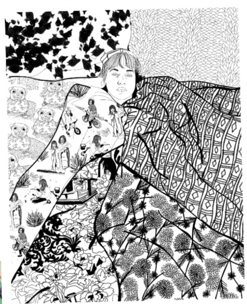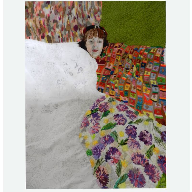 My research has centred around the transition from the past, present onto my future self. Memory and the fragmentation of past events through imagery, design, print and colour have been used to relay a life cycle of experiences embroidered onto a duvet, an everyday object that protects and comforts an ever-growing developing human being. Bedtime and sleep can mean a reflection on events before drifting off to sleep, to dream in what can be a series of thoughts and images and sensations. The beginning of the story is a self-portrait and continues with embroidery of my life through marriage, love, parenthood and other major milestones.