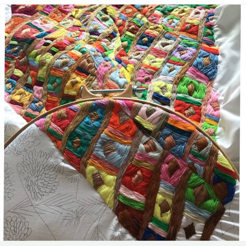 The duvet is moving in a clockwise direction. The ‘knitted section’ represents my time at University studying textiles, moving onto my printed design career made up of textured geometrics, my ownership of a home in an estate named after flowers, a new build estate that has changed the local landscape. My wedding photo backdrop, a toile du jour of my children, my little adventure into embroidered animals during lockdown and the abstract textured section to represent the uncertainty of the future being an artist and mother. The image is a close up of my work as a printed textiles designer. It was a job that saw a lot of changes in technology. I started by hand painting images onto fabric and slowly transitioned into CAD. Fabrics where digitally printed but later warped onto digital visions of how the prints would look, ready for people to download. Throughout there remained a desire for images/patterns to be created by hand, a romance with creativity. Often when seeing my designs in shops the way to truly know it was mine was in the mistakes made. In the embroidery this is represented by one diamond being blue, whilst the others are tan.