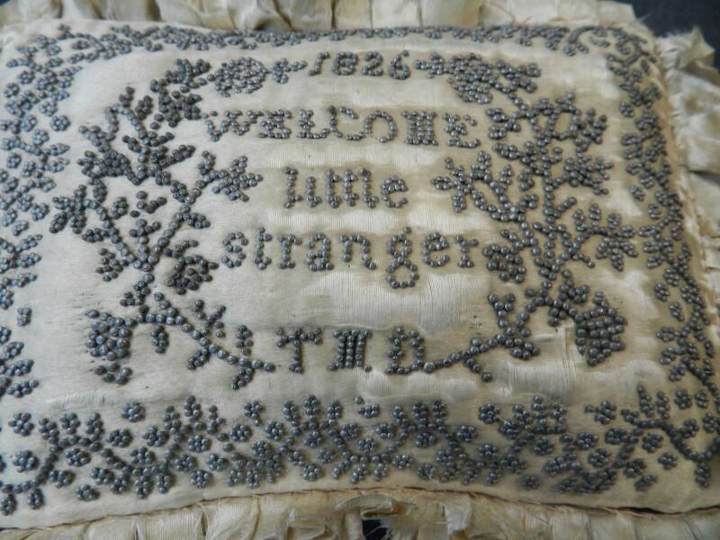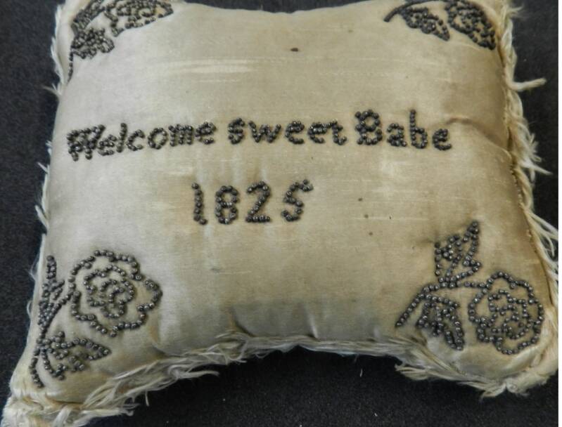 The other pin cushions Merl had in their collection are commemorative, celebrating two births. These are layette pin cushions and served both as a decorative gift and a practical one as before the 1870s regular pins were essential for fastening baby clothes and cloth nappies.