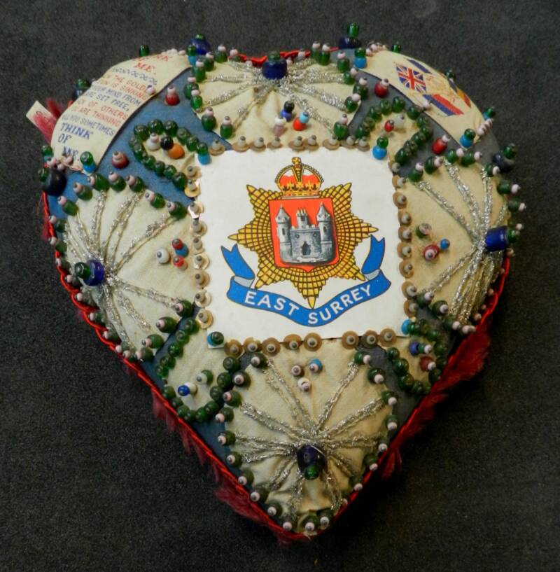 Sweetheart Pin Cushions have often fascinated me. The level of decoration, pattern and colour that would have embellished these soft luxurious keepsakes can still be discovered today in their faded grandeur. In 2025 I answered Hand & Lock's brief on Artistry and Archive and knew exactly what I wanted to do. My first quest was to find a museum that had one in stores. Luckily, I live very close to Merl (Museum of English Rural Life) and luck should have it they had one such pincushion in store, hooray I found my object. A heart shaped pin cushion made from a kit by a recuperating soldier. What struck me was how bright this treasure was. The braiding around the edge was missing perhaps used to decorate something else or simply perished over time. The maker unknown, the only information was that it was donated by Mrs Old. Was Mrs Old supposed to ‘Think of Me ‘? The verse, often cited, an inscription to urge the owner to think of the maker during lighter moments. What struck me about this sentiment is that after the loss and suffering of war all the creator wants is not to be forgotten, to be in someone's heart and mind at the end of the day before rest. My research isn’t one of loss and sadness but love and hope.