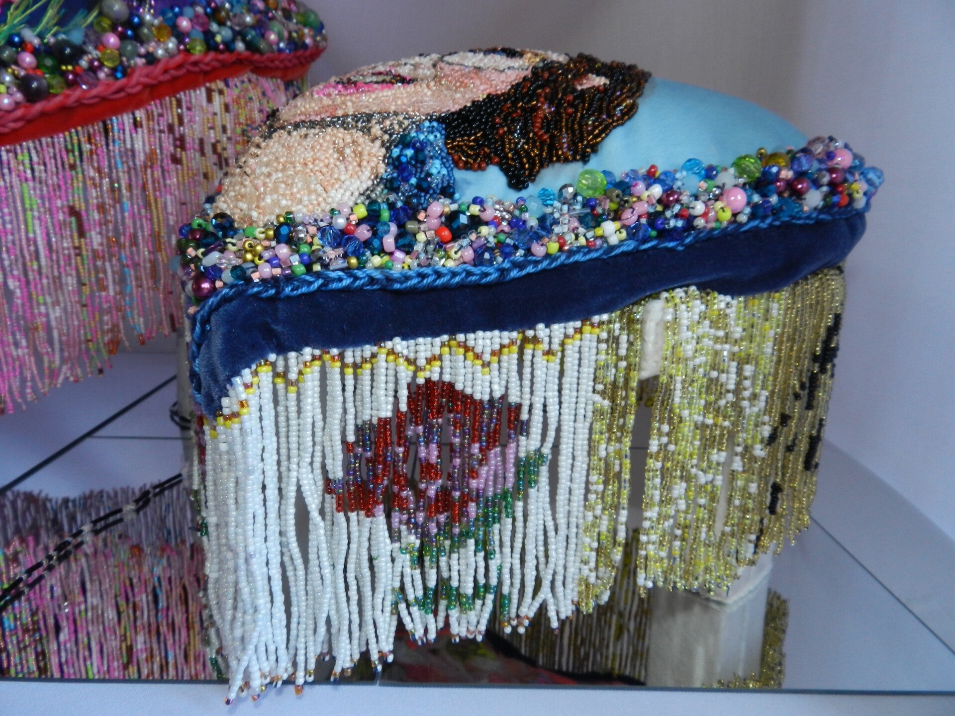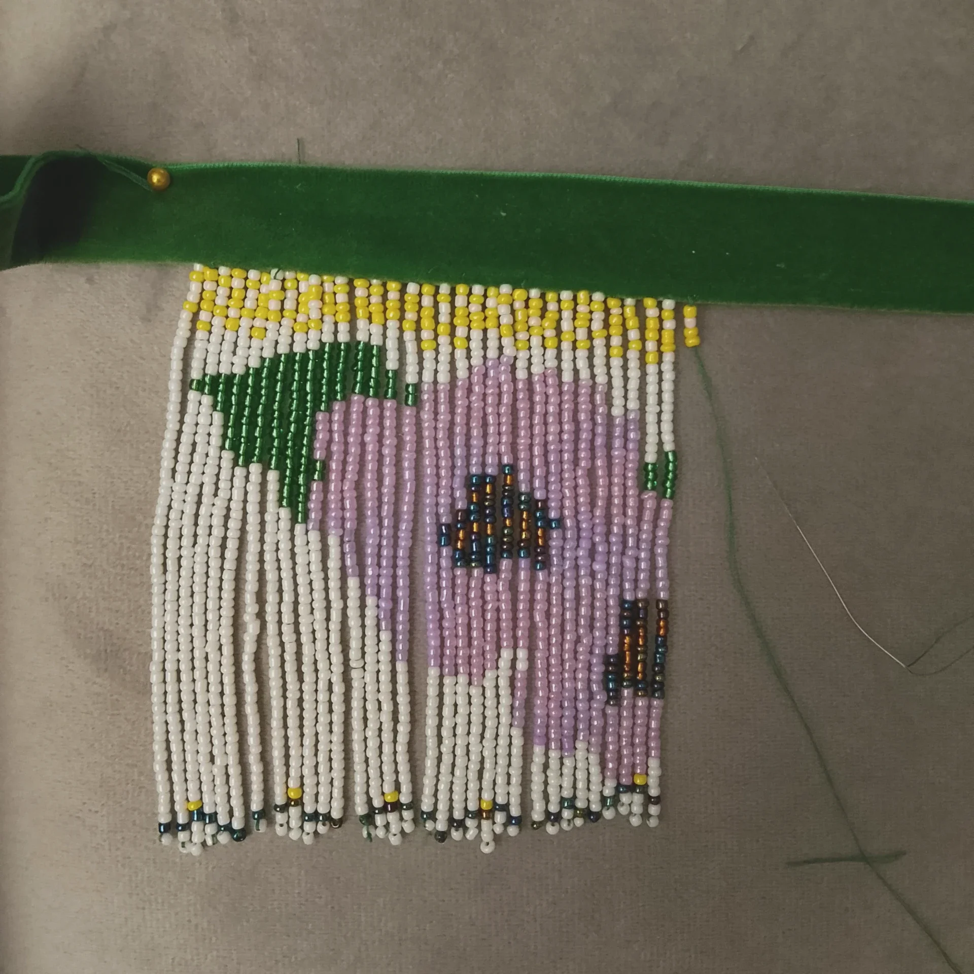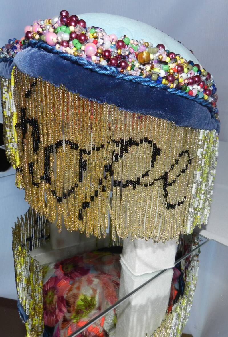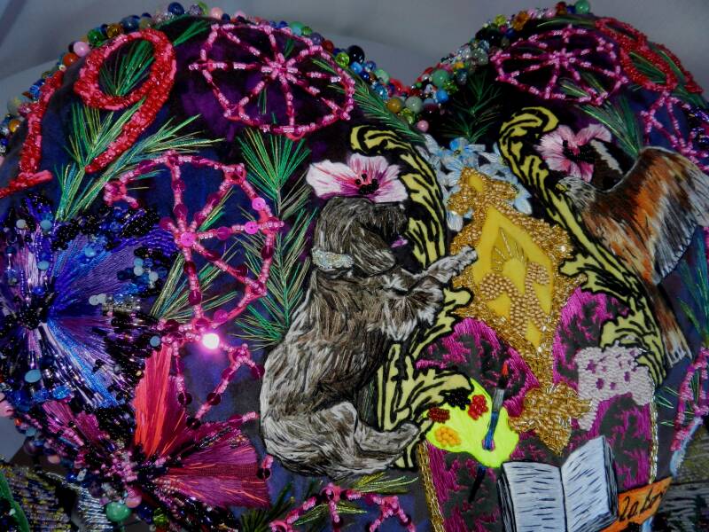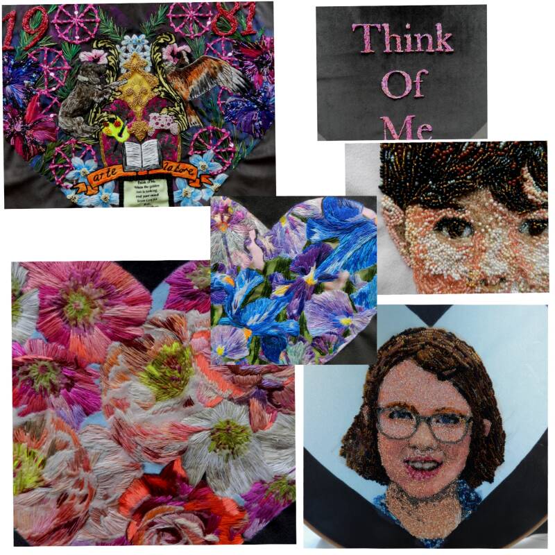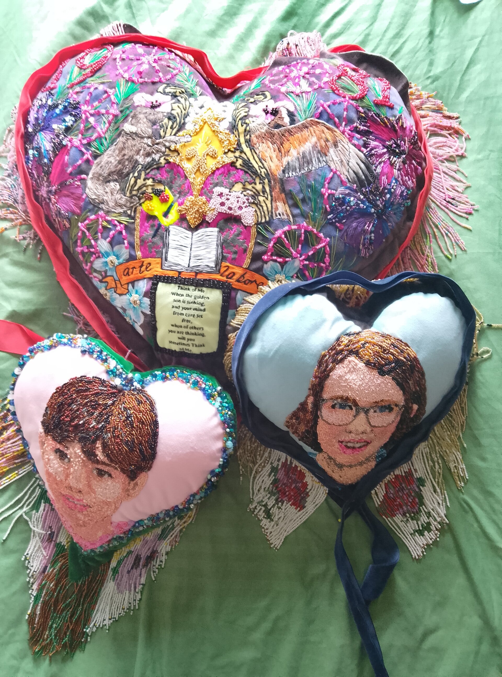 The two smaller hearts are of my daughters, a beaded digital portrait on velvet with florals on the back matching their middle names, Rose and Iris. The words hope and love are featured in the trim; two aspects of life I wish my daughters to have an abundance of.