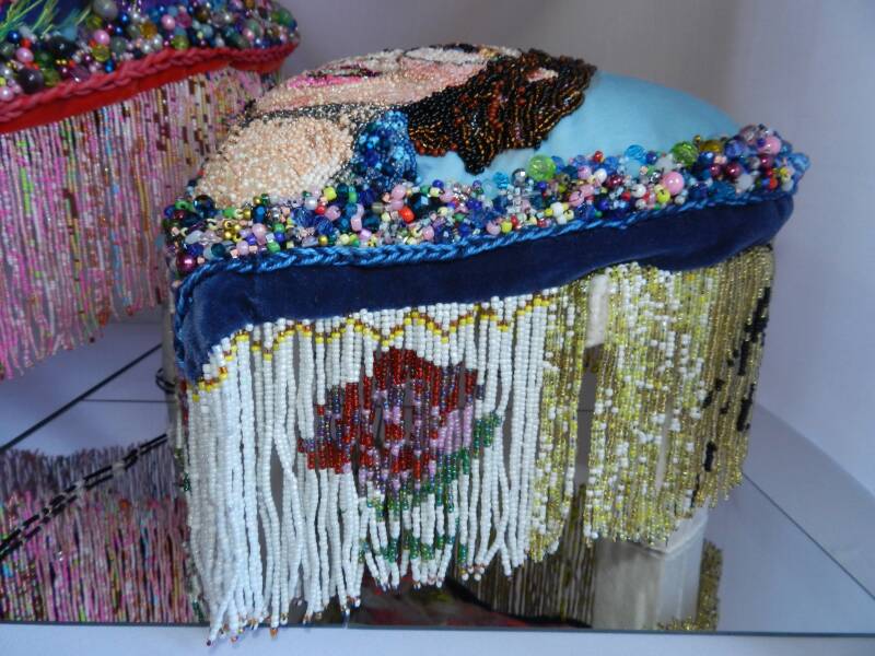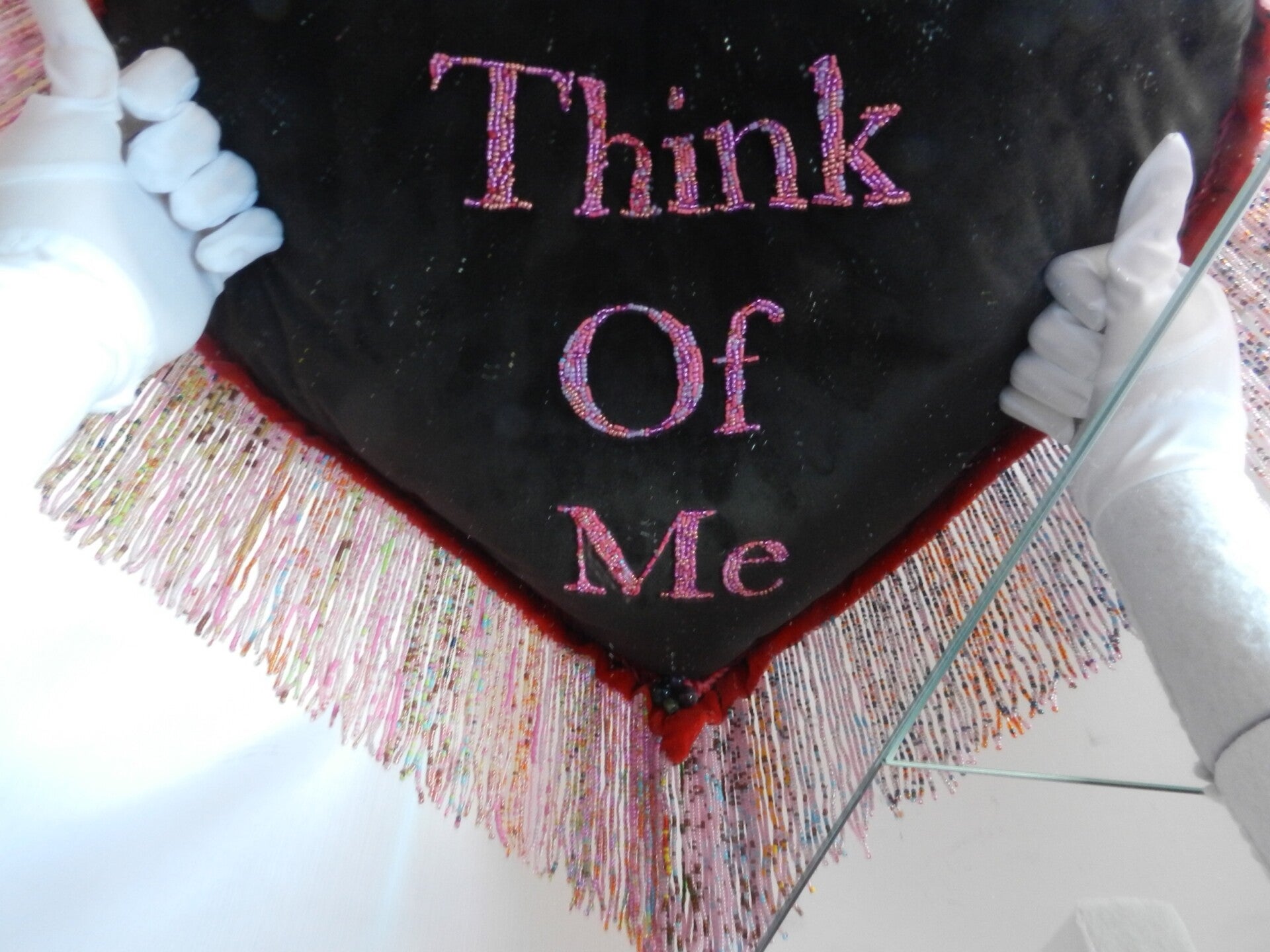 And here they all are. For the presentation of these cushions, I wanted the cushions to float so that the viewer can see the underneath part of the cushions and so that the fringing would dangle. The main cushion is held aloft by two wooden hands wearing white archival handling gloves with the smaller cushions being propped up by wooden building blocks covered in white felt. The building blocks of life and a toy used by my two daughters when they were young. The beading connecting the hearts is morse code. The bugle beads represent dashes and seed beads dots. The phrase repeated is “think of me,” a phrase that often appeared in this project. The QR code links the audience to this page. When I was researching, I discovered that museums/organisations are archiving their digital content.